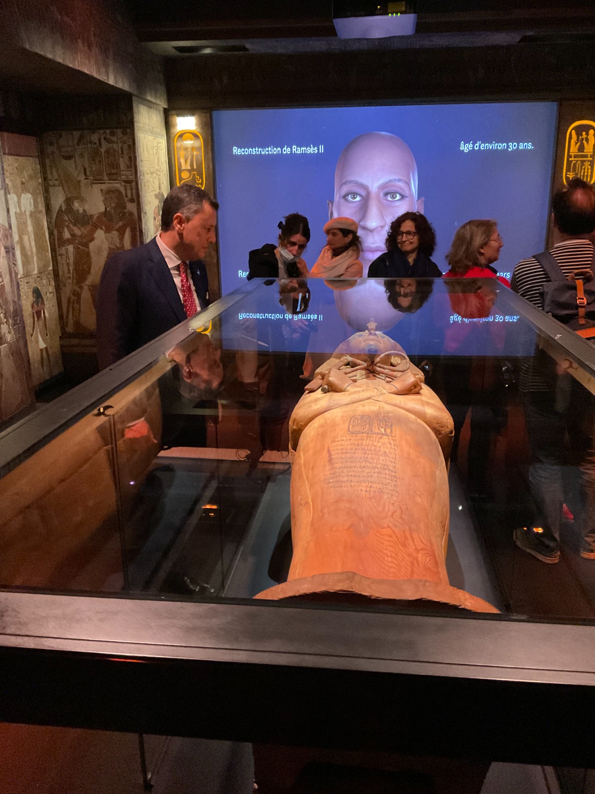 وأوضح الوزير أنه تم اختيار تابوت مومياء الملك رمسيس الثاني لعرضه بشكل استثنائي لأول مرة خارج مصر في هذه النسخة من المعرض وهو ما يأتي تقديراً لدور العلماء الفرنسيين في تقديم المساعدة والدعم في ترميم ومعالجة مومياء الملك رمسيس الثاني في عام 1976، معرباً عن تقدير الشعب الفرنسي البالغ لهذا المعرض وولعهم وشغفهم الكبير بالحضارة المصرية القديمة والتي تعتبر جزء أصيل وهام من تاريخ مصر العريق.