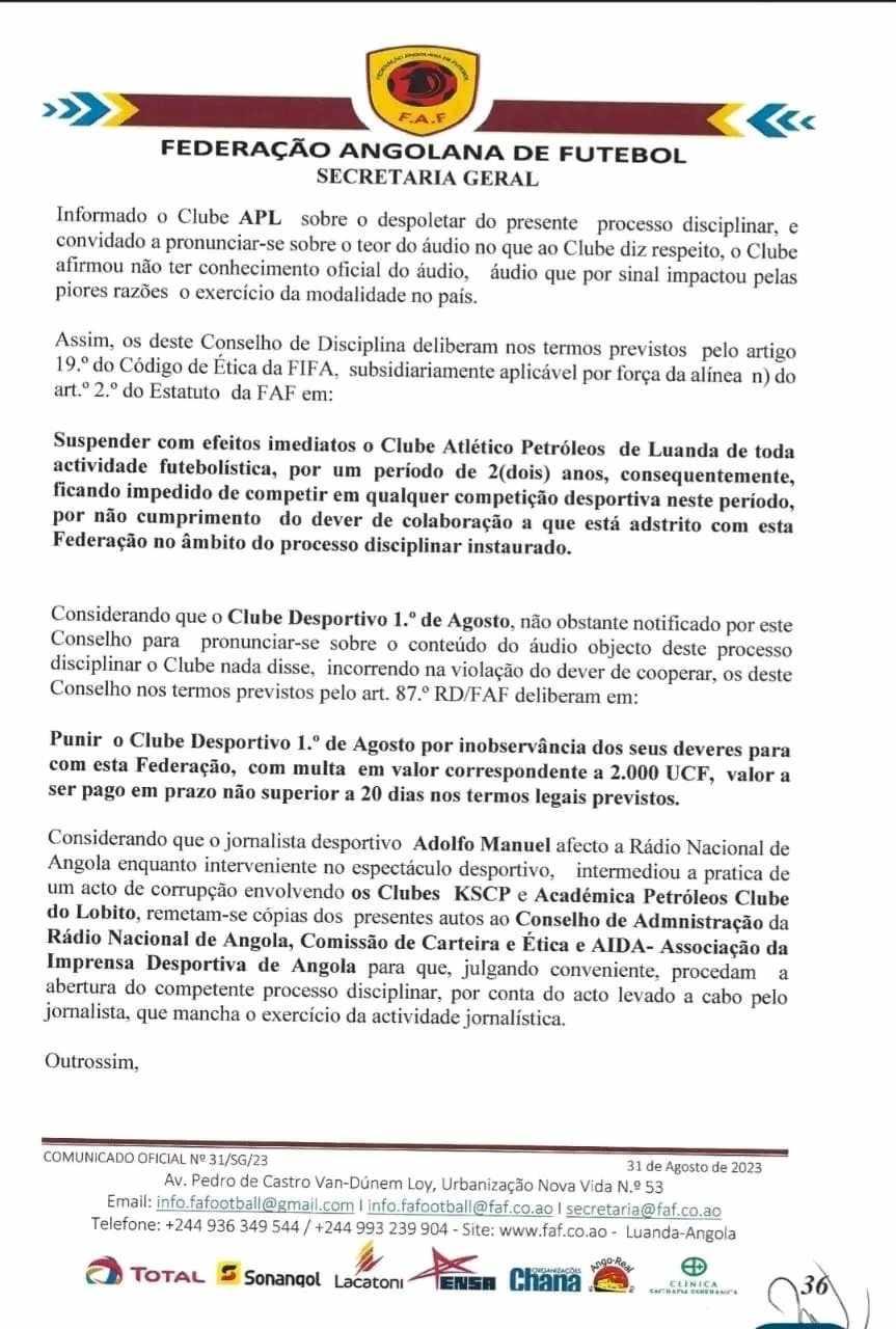 ونشر نادي بترو أتلتيكو بيانا رسميا عبر صفحته على موقع التواصل الاجتماعي “فيسبوك” صباح اليوم، كشف فيه عن تلقيه خطابا من الاتحاد الأنجولي يُفيد بإيقافه لمدة عامين من ممارسة أي نشاط يتعلق بكرة القدم، وذلك بتاريخ 31 أغسطس المنقضي.